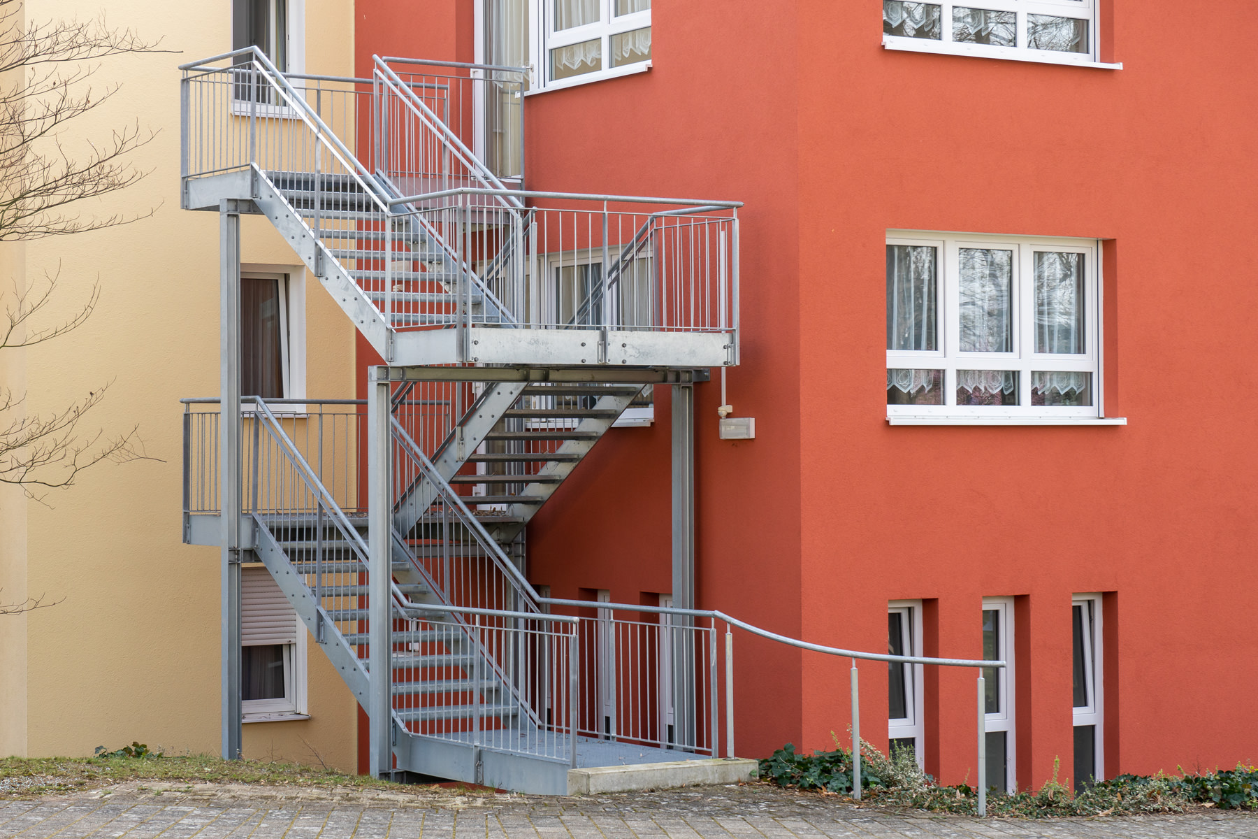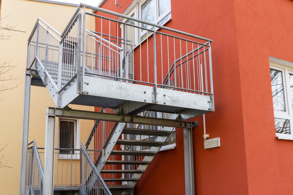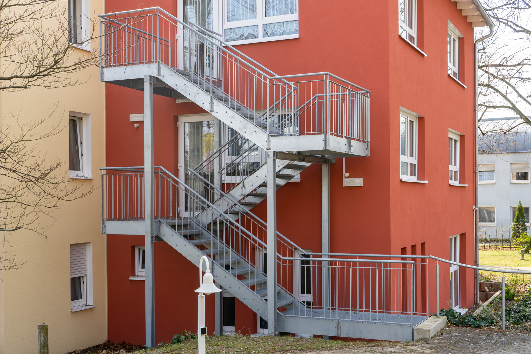 • Flachstahlwangentreppe 3-läufig mit An- und Austrittspodest